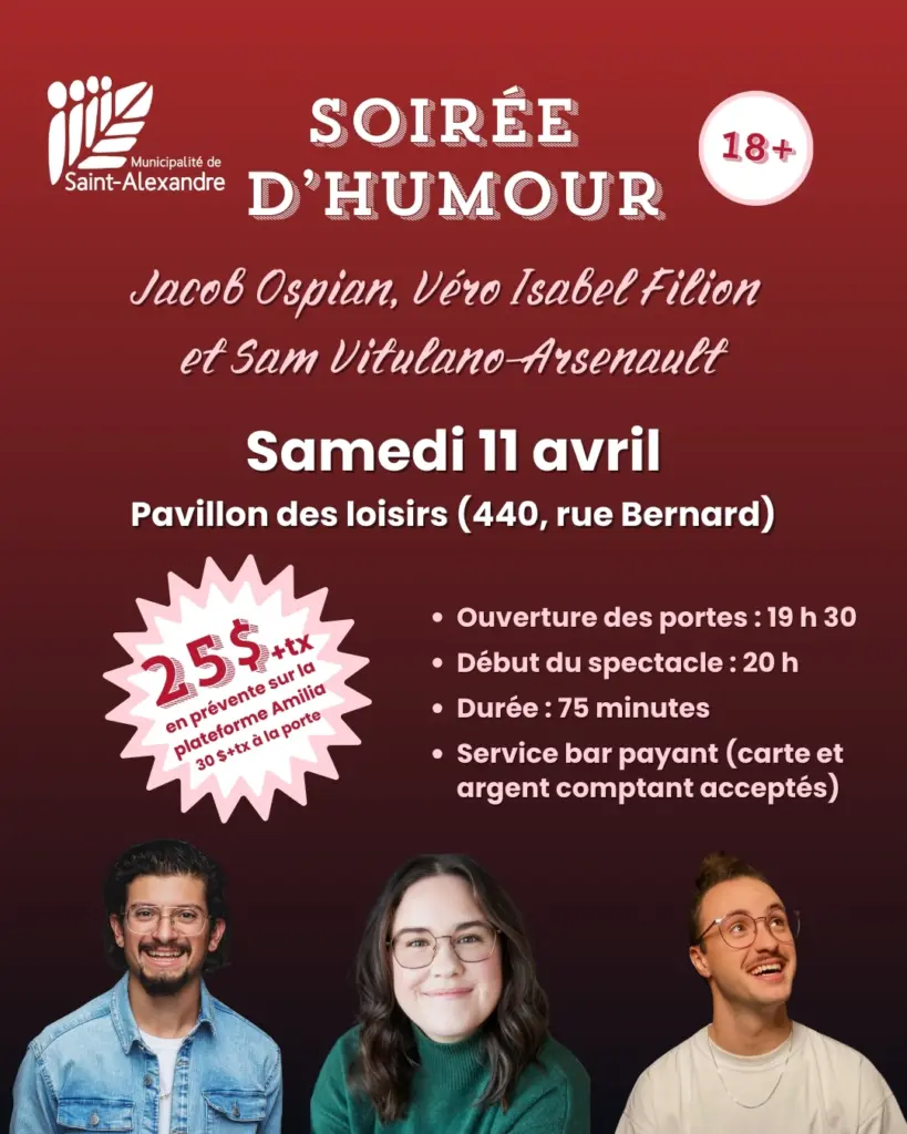 En avril, les humoristes Jacob Ospian, Véro Isabel Filion et Sam Vitulano-Arsenault vous attendent à la Municipalité de Saint-Alexandre! Devant le bel enthousiasme de la soirée d’humour en novembre dernier, comment ne pas renouveler l’expérience?