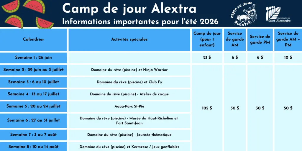 La gestion du camp de jour est assurée par le service des loisirs et de la culture de la Municipalité de Saint-Alexandre. Pour obtenir plus d’informations, communiquez avec Maxime Fortier, coordonnateur des loisirs, de la culture et des communications au mfortier@saint-alexandre.ca ou 450 346-6641, poste 1340.