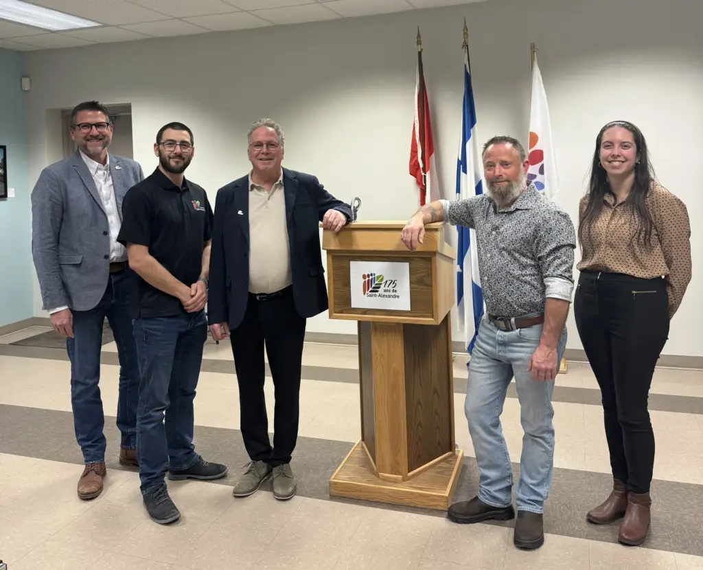 De gauche à droite, monsieur Stéphane Vézina, conseiller, monsieur Maxime Fortier, coordonnateur des loisirs, de la culture et des communications, monsieur Yves Barrette, maire, monsieur Rémi Cusson, conseiller, madame Audrey Chagnon, agente aux communications et aux loisirs. Nous pouvons également y observer le nouveau logo du 175e de la Municipalité de Saint-Alexandre sur le lutrin.