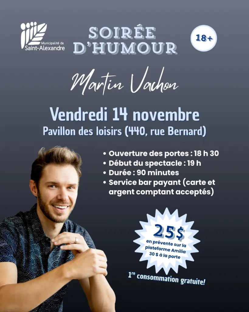 En novembre, un spectacle d’humour mettant en vedette Martin Vachon aura lieu à la municipalité de Saint-Alexandre!