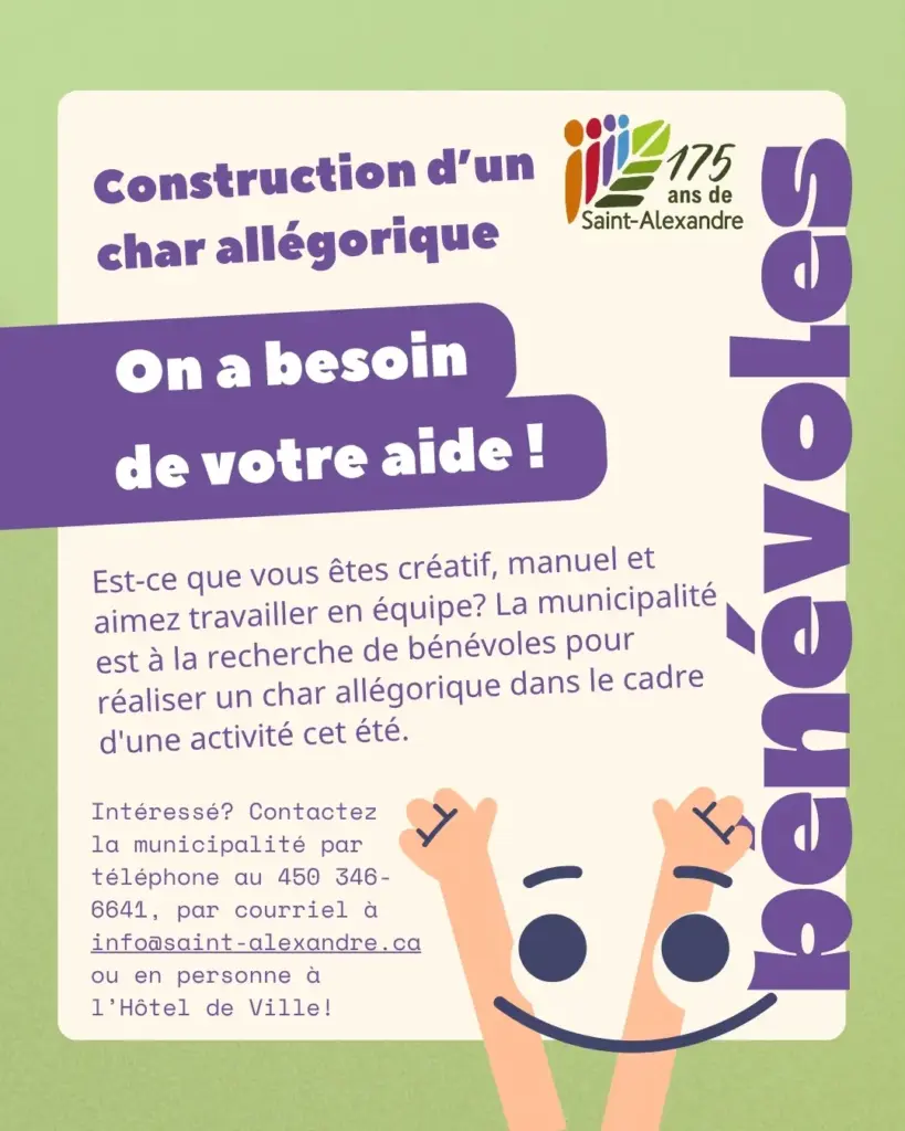 Intéressé? Contactez la municipalité par téléphone au 450 346-6641, par courriel à info@saint-alexandre.ca ou en personne à l’Hôtel de Ville (453, rue Saint-Denis)!