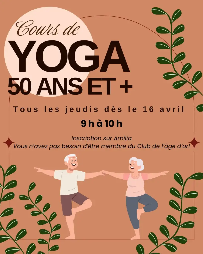 La municipalité de Saint-Alexandre en collaboration avec le Club de l’âge d’or ouvre à nouveau un cours de yoga pour les 50 ans et plus! Voici tous les détails en lien avec les cours :