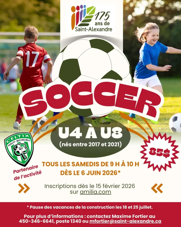 La Municipalité de Saint-Alexandre en collaboration avec le Celtix du Haut-Richelieu offre aux enfants de 4 à 8 ans la possibilité de s’initier au merveilleux sport qu’est le soccer. À raison d’une fois par semaine, les enfants pourront se familiariser avec les différentes techniques de manipulation du ballon de soccer. De simuler des parties, de s’amuser et de travailler en collaboration avec les autres enfants.