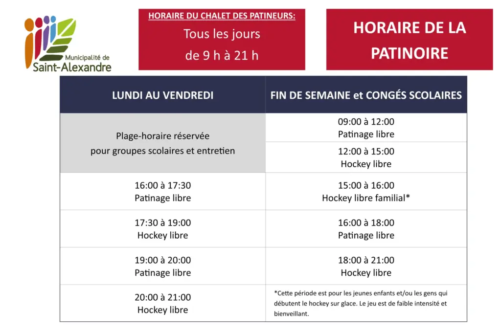| Surface multifonctionnelle – Patinoire | Ouvert du lundi au vendredi de 16 h à 21 h Ouvert la fin de semaine et les congés scolaires de 9 h à 21 h | Ouverte* |