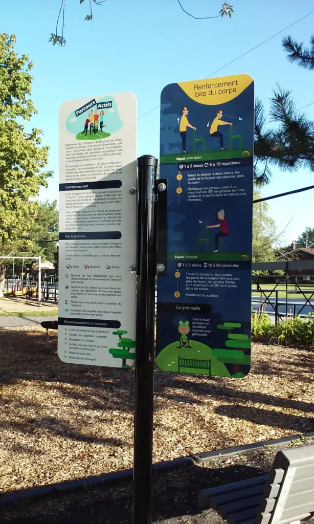 Le Parcours Actif est composé de 10 panneaux d’exercice utilisant le mobilier urbain en place dans le parc. Un premier côté de panneau présente des exercices de renforcement avec deux options d’intensité et un exercice ludique pour les enfants, tandis que l’on retrouve deux exercices d’étirement de l’autre côté. Le parcours est accessible en tout temps au parc Marie-Jeanne-Frégeau. Ce projet a été rendu possible grâce à une collaboration avec la Municipalité de Sainte-Anne-de-Sabrevois, qui offre les visuels des panneaux aux organisations intéressées.
