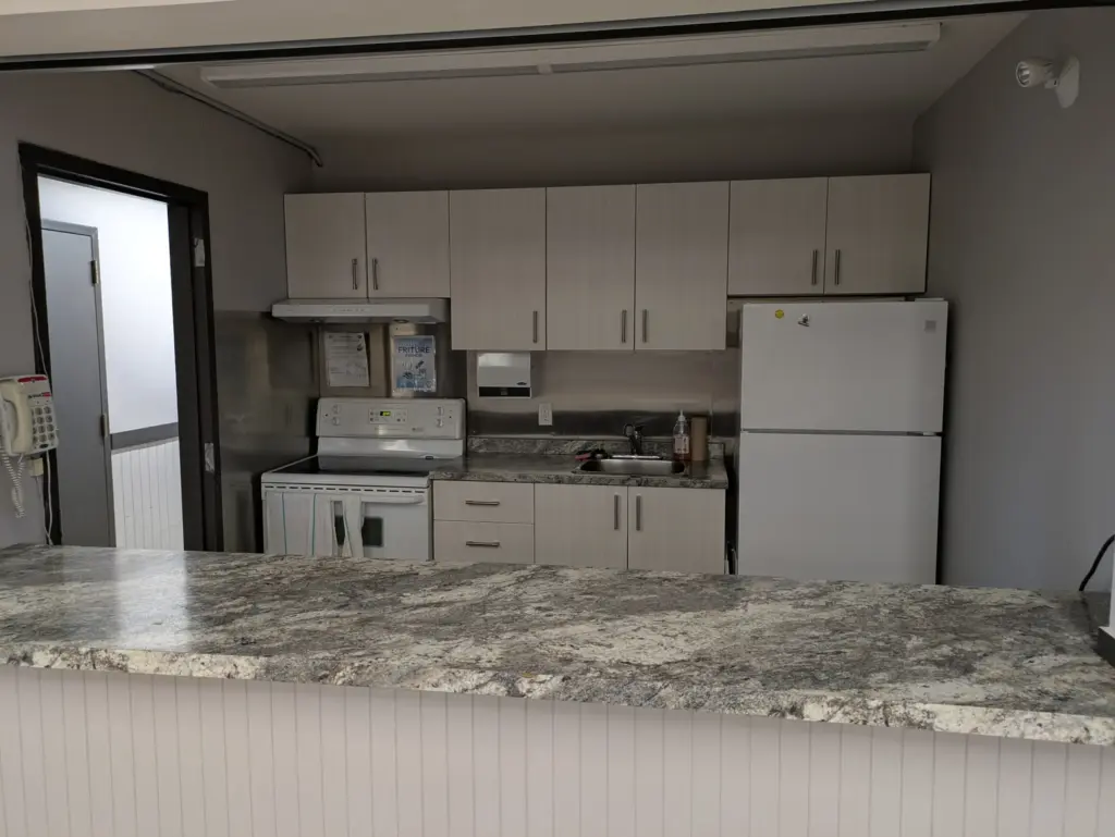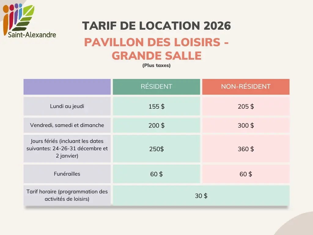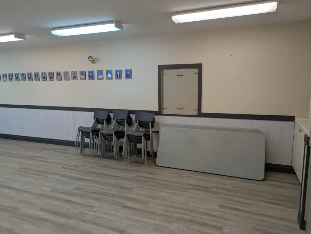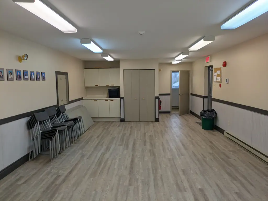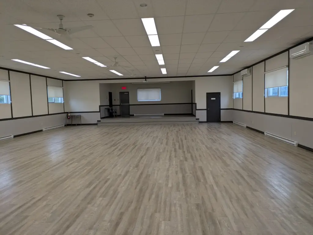 Au rez-de-chaussée, la grande salle est équipée d’un vestiaire, d’une petite scène et d’une cuisinette avec cuisinière et réfrigérateur. Des tables rectangulaires (6 pieds x 3 pieds), des tables rondes (6 pieds de diamètre) et des chaises sont disponibles. Capacité maximale de 150 personnes.