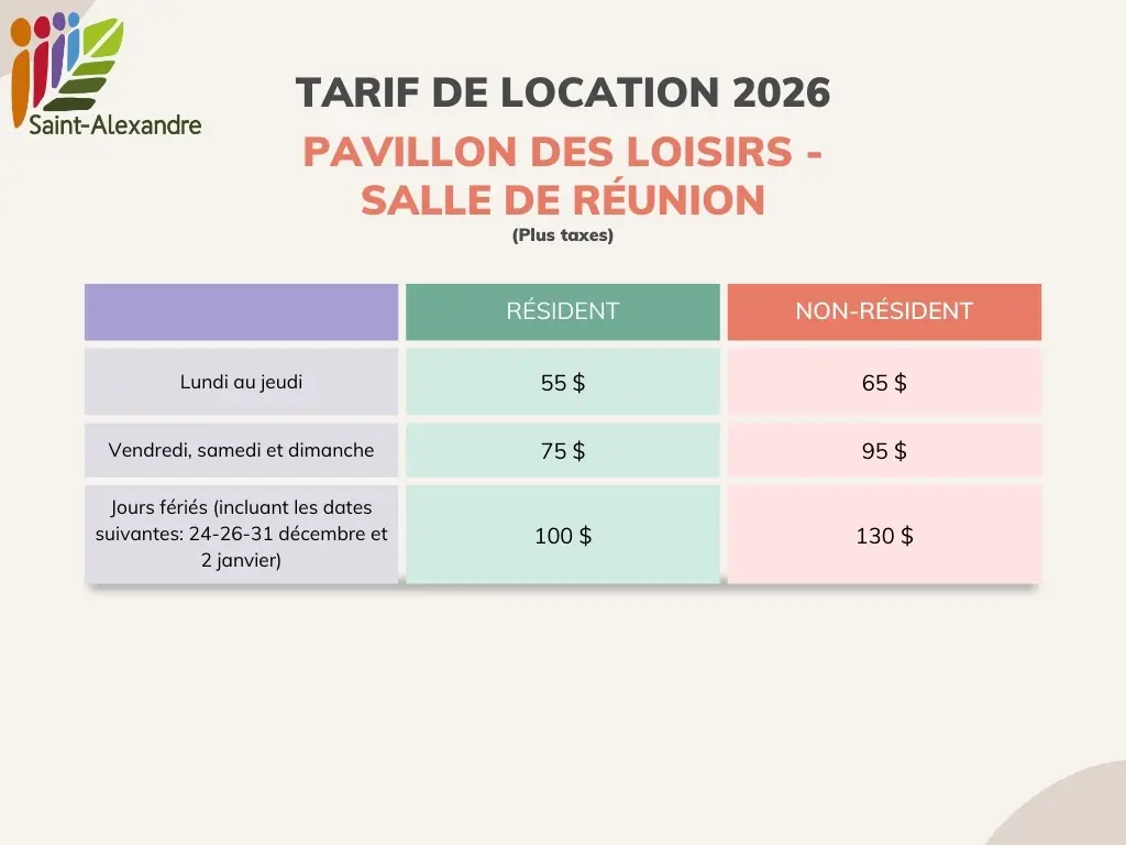 Le centre communautaire municipal, communément appelé le Pavillon des loisirs, accueille les cours, les activités de loisir et les événements. Il offre deux plateaux, soit la grande salle de réception et la petite salle de réunion. Il se situe à proximité des terrains sportifs et du parc Marie-Jeanne-Frégeau. Une borne de recharge pour véhicule électrique est accessible dans le stationnement.