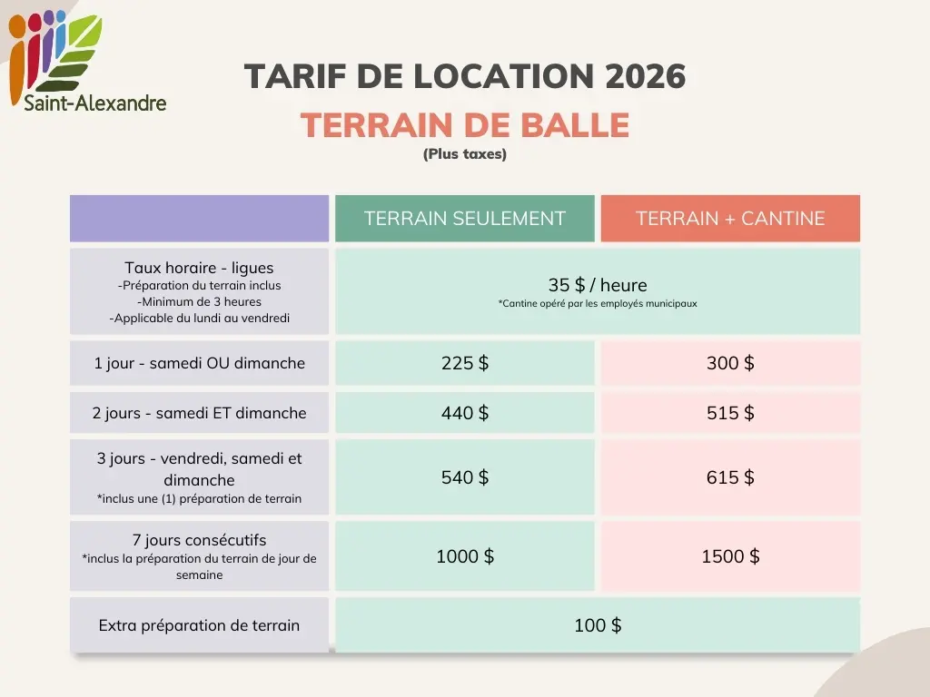 Renommé dans la région pour sa qualité, le terrain de balle molle dessert les équipes locales de balle donnée pour adulte. L’estrade couverte en fait une installation appréciée des spectateurs. Il est disponible pour la location en période estivale. Pour connaître les tarifs, communiquez avec le service des loisirs 450 346-6641, poste 5.